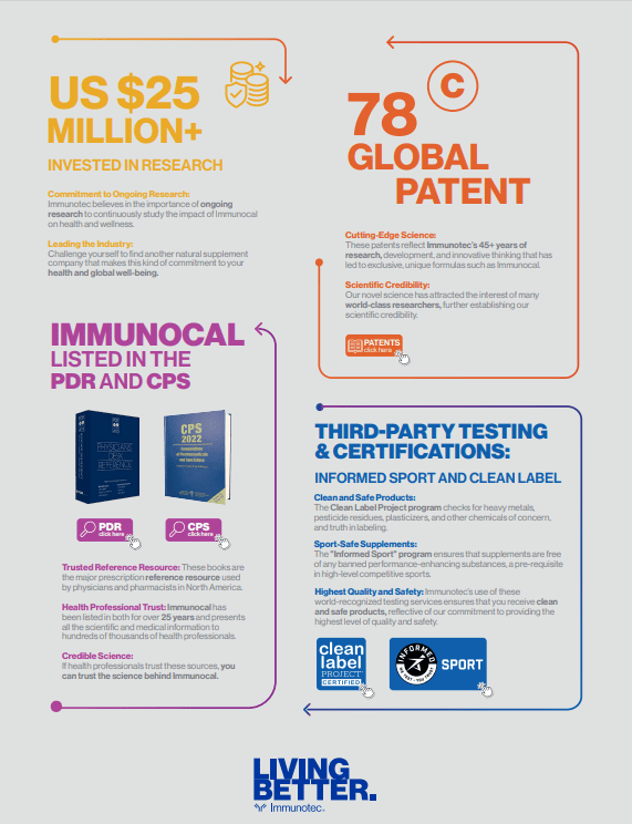 Immunotec’s scientific credibility is reinforced by its Scientific Advisory Board (SAB), composed of experts in health, medicine, and biotechnology, who ensure that the company’s products meet the highest quality standards. Additionally, Immunocal has been listed in the PDR (Physicians’ Desk Reference) and CPS (Compendium of Pharmaceuticals and Specialties), two of the most trusted medical reference resources in North America.