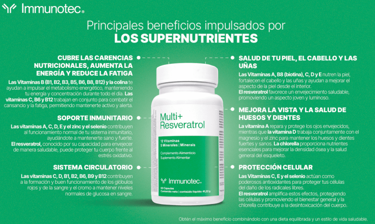 ¿Te imaginas un suplemento que no solo te llena de energía, sino que además mejora tu piel, fortalece tu sistema inmune y protege tus células del envejecimiento prematuro? Con Multi+Resveratrol de Immunotec, ahora es posible.