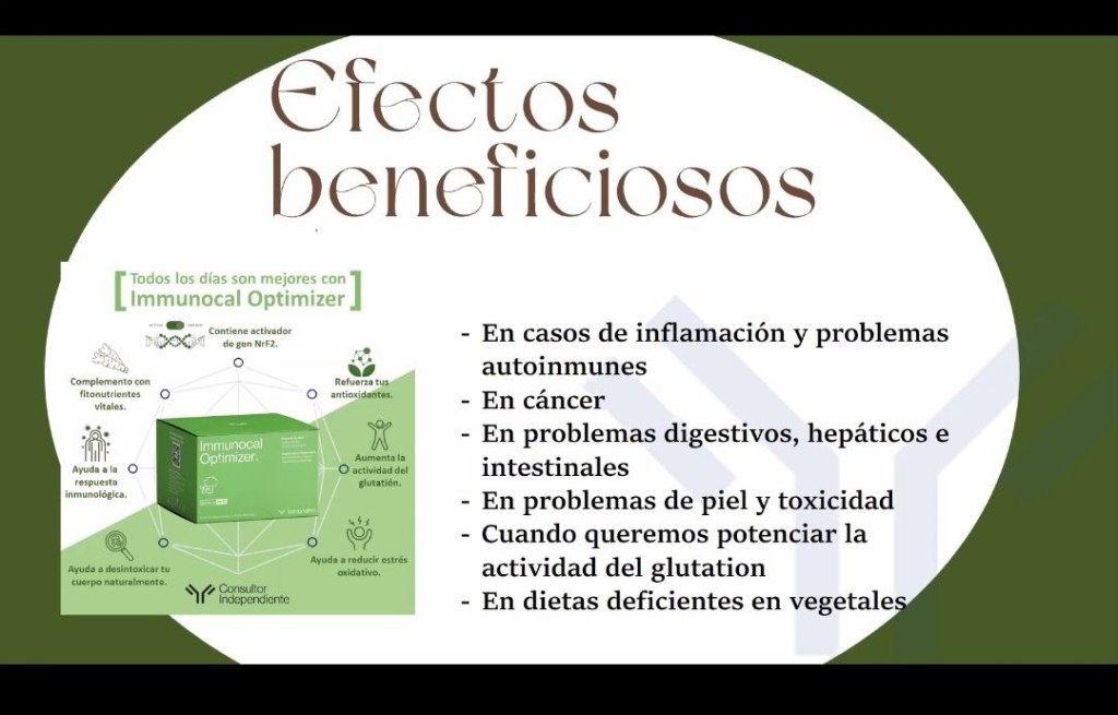 El Immunocal Optimizer de Immunotec es un suplemento diseñado para complementar y potenciar los efectos del Immunocal. Formulado con sulforafano, un compuesto extraído de la semilla de brócoli, este producto activa el transcriptor Nrf2, un gen clave para la desintoxicación natural del cuerpo y la protección contra el estrés oxidativo. Al activar Nrf2, el Immunocal Optimizer no solo ayuda a mejorar la actividad del glutatión, sino que también potencia la efectividad de todos los antioxidantes en el cuerpo hasta tres veces más durante 72 horas.